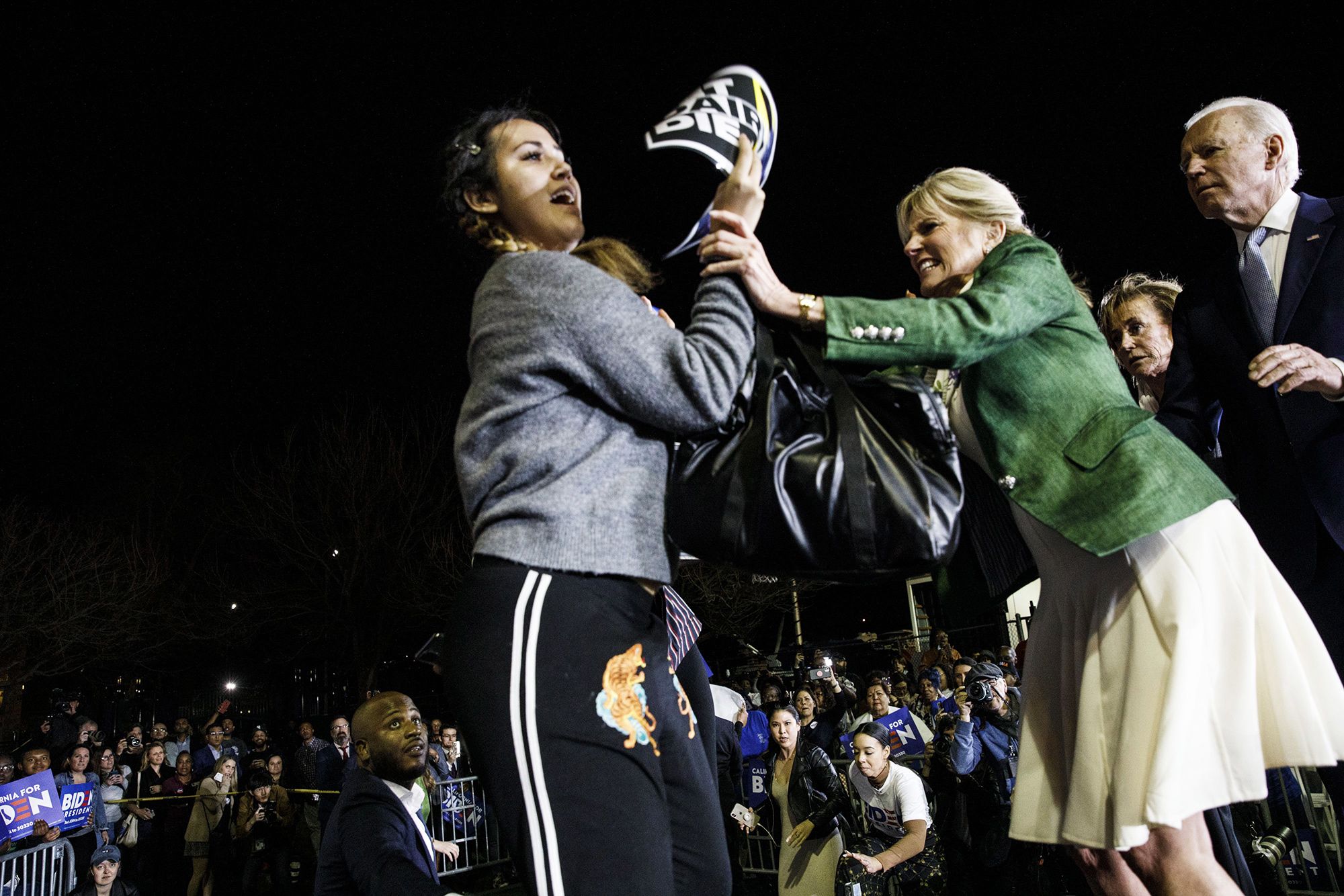 Jill Biden blocks an anti-dairy protester who tried to reach the stage during a primary night rally for Joe Biden in Los Angeles on March 3. (Patrick T. Fallon / Bloomberg via Getty Images)