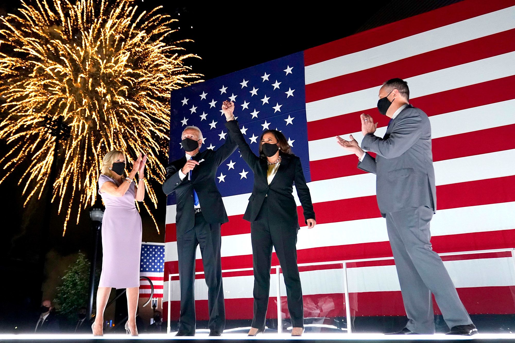 Joe Biden and Sen. Kamala Harris celebrate the end of the Democratic National Convention on Aug. 20 in Wilmington, Del. At left is Biden's wife, Jill, and at right is Harris' husband, Doug Emhoff. (Andrew Harnik / AP)