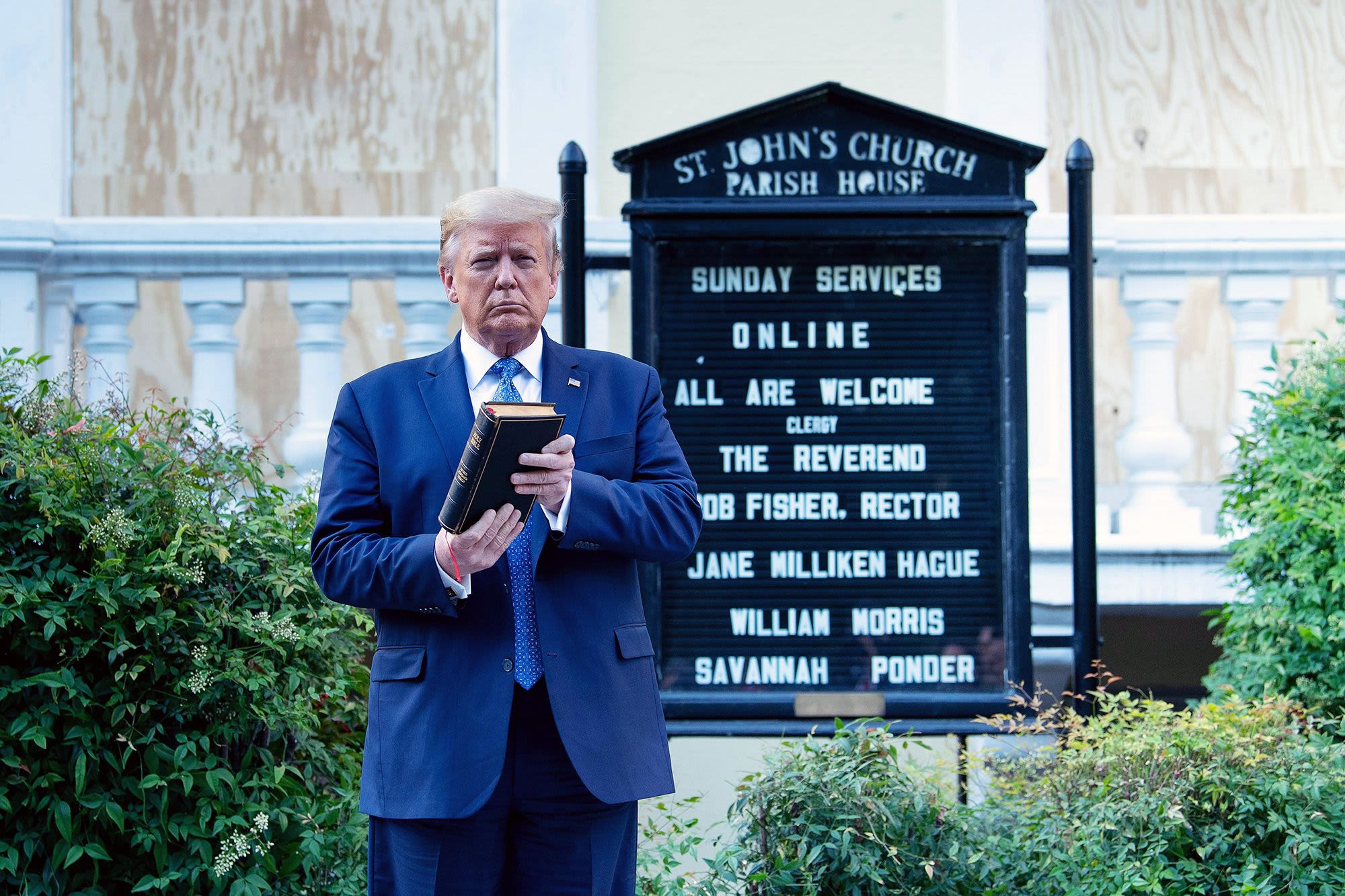 President Donald Trump holds a Bible while visiting St. John's Church across from the White House after the area was cleared of people protesting Floyd's death on June 1. (Brendan Smialowski / AFP - Getty Images)