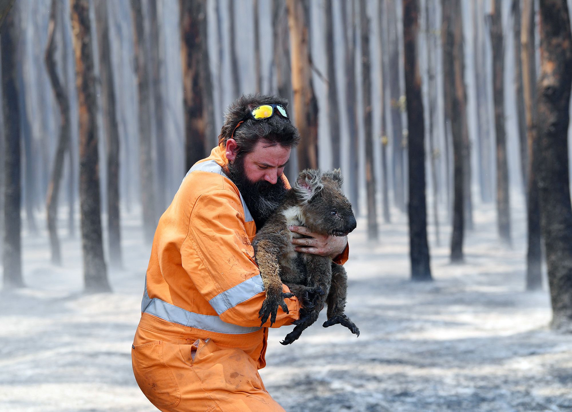 Wildlife rescuer Simon Adamczyk holds a koala in a burning forest near Cape Borda on Kangaroo Island, southwest of Adelaide, Australia, on Jan. 7. (David Mariuz / AAP Image via Reuters)