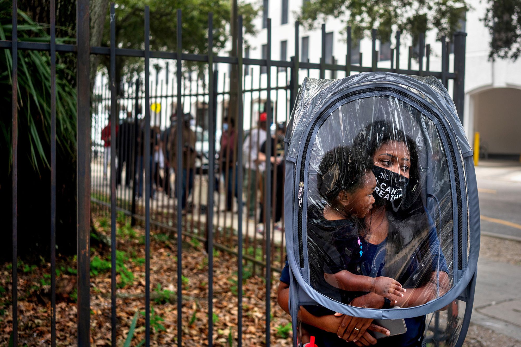 Dana Clark wears a safety pod as she waits in line to vote with her 18-month-old son, Mason, as early voting began for the presidential election in New Orleans on Oct. 16. (Kathleen Flynn / Reuters)