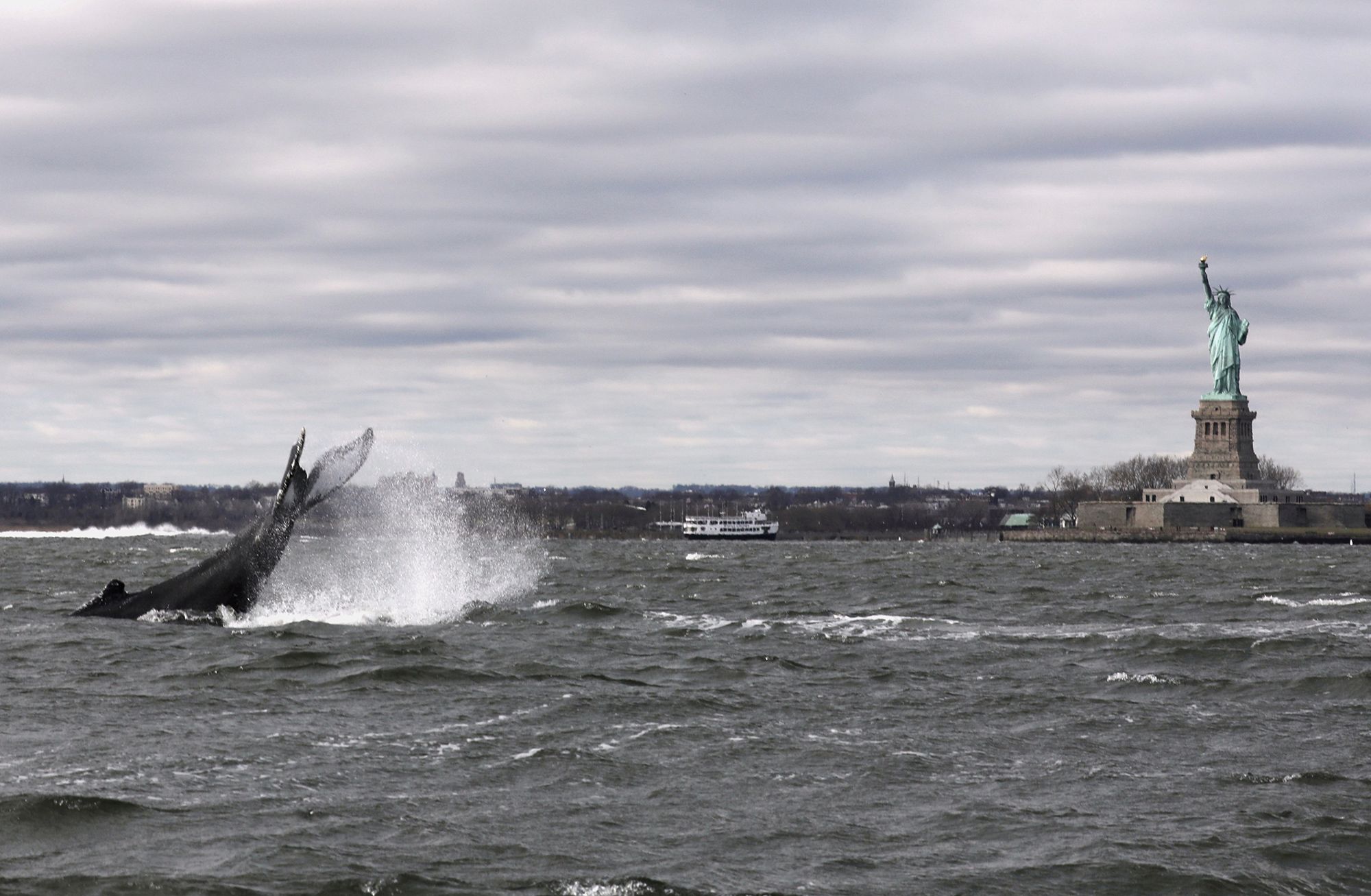 A humpback whale surfaces near the Statue of Liberty in New York Harbor on Dec. 8. (Bjoern Kils / New York Media Boat via Reuters)