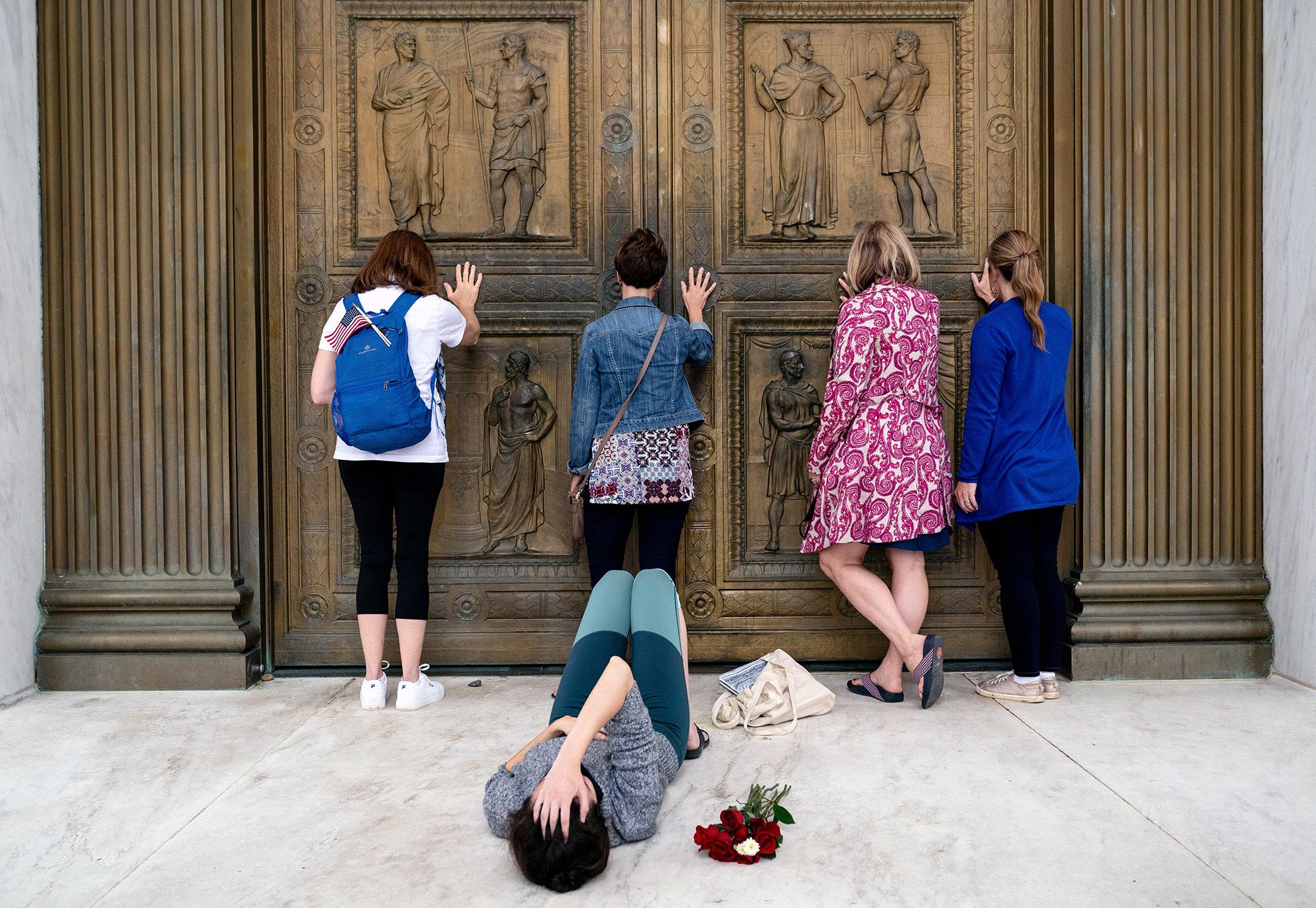 Supporters of Judge Amy Coney Barrett's nomination to the Supreme Court pray while touching the doors of the court as Jacquelyn Booth lays on the ground mourning the death of Justice Ruth Bader Ginsburg on Sept. 26. (Erin Schaff / The New York Times via Redux)