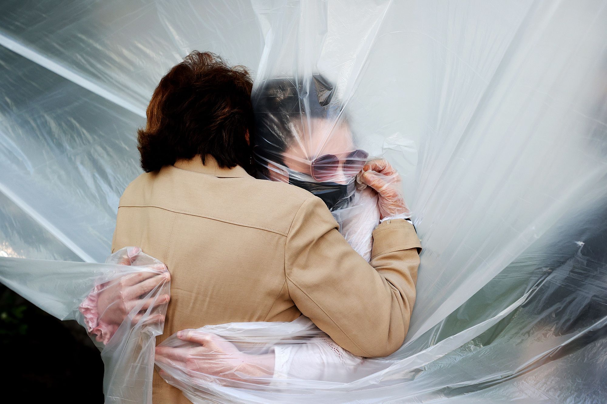 Olivia Grant, right, hugs her grandmother, Mary Grace Sileo, through a plastic drop cloth hung up on a homemade clothes line in Wantagh, N.Y., on May 24. It was the first time they had contact since the pandemic began. (Al Bello / Getty Images)