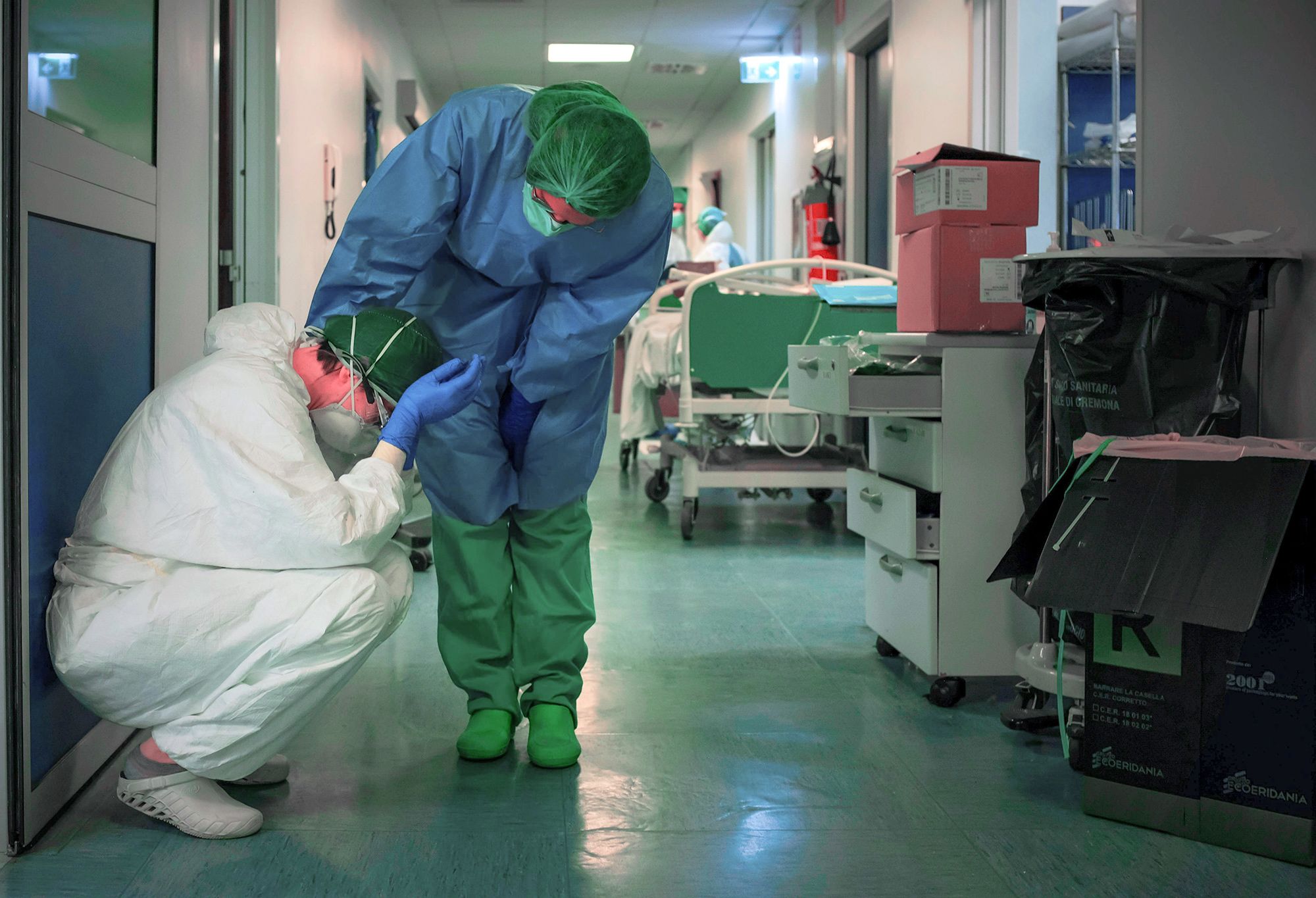A nurse comforts a colleague in the ICU of a hospital in Cremona, Italy, southeast of Milan, on March 13. (Paolo Miranda / AFP - Getty Images)