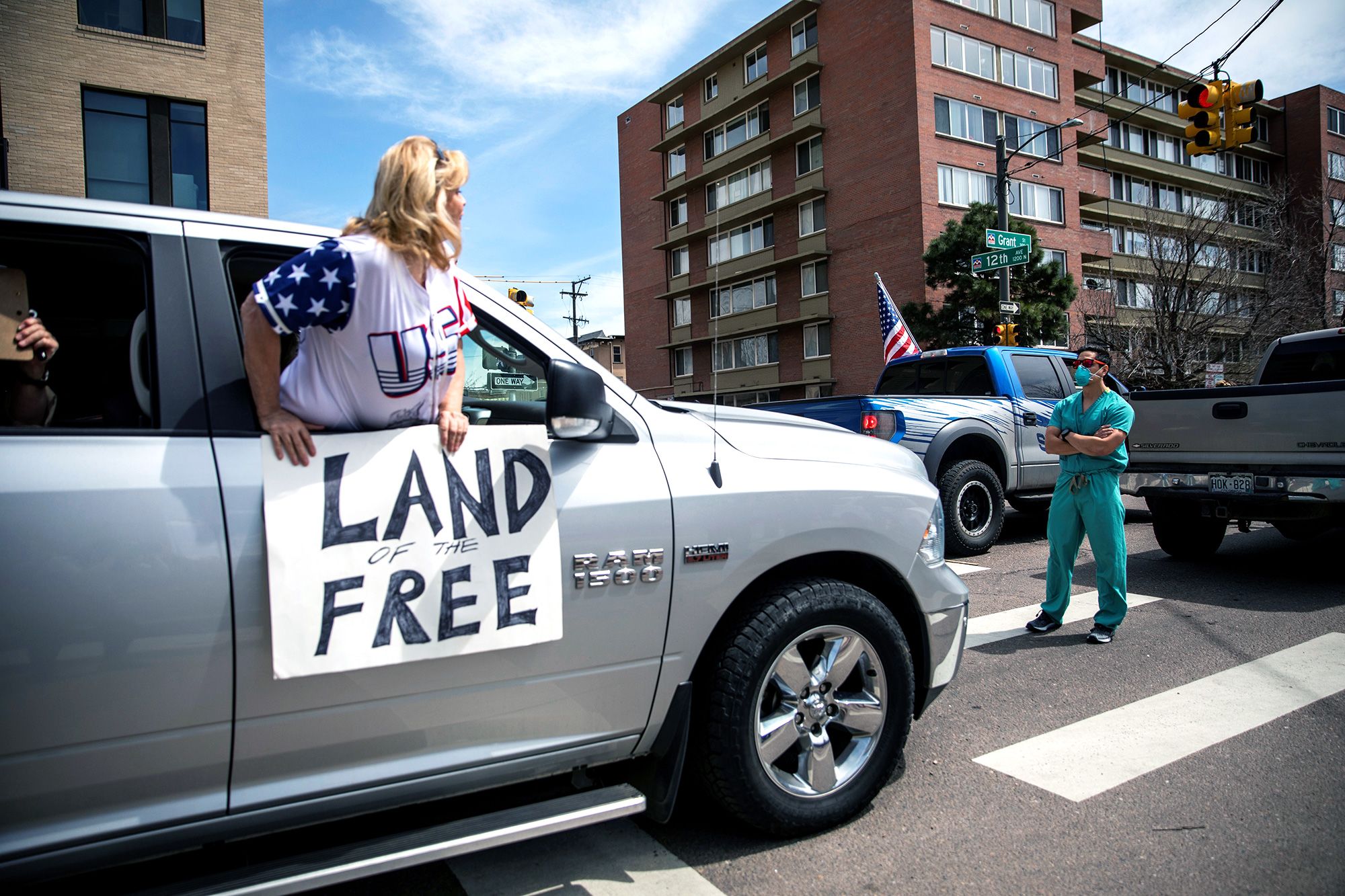 A health care worker stands in front of a car in counterprotest to hundreds of people who gathered at the State Capitol in Denver on April 19 to demand that a stay-at-home order be lifted. (Alyson McClaran / Reuters)