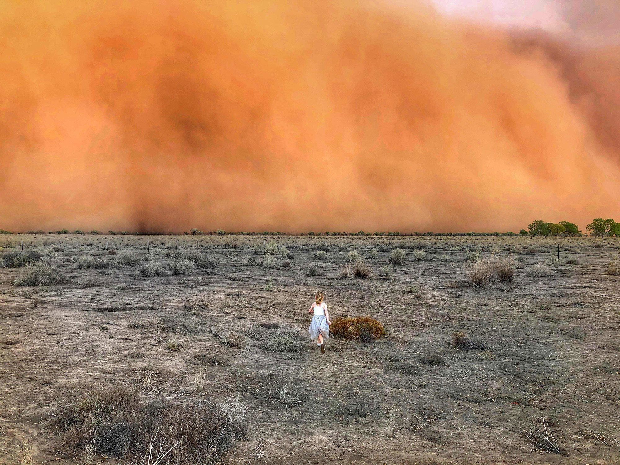 A child runs toward a dust storm in Mullengudgery in New South Wales, Australia, on Jan. 17. (Marcia Macmillan / AFP - Getty Images)