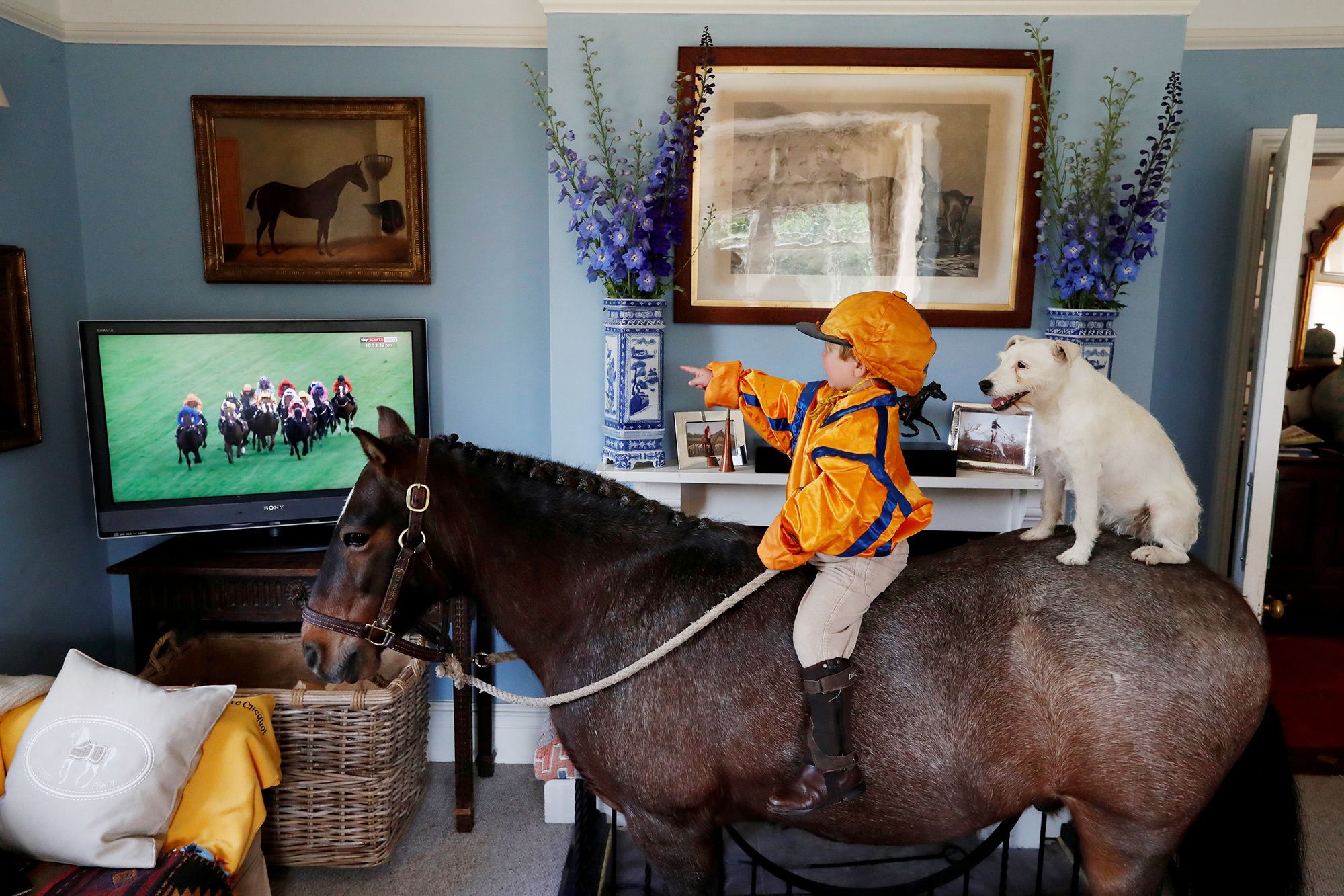 Three-year-old Merlin Coles watches a horse race at his home in Bere Regis, England, on June 17. He sat on his horse, Mr. Glitter Sparkles, with his dog, Mistress. (Paul Childs / Reuters)
