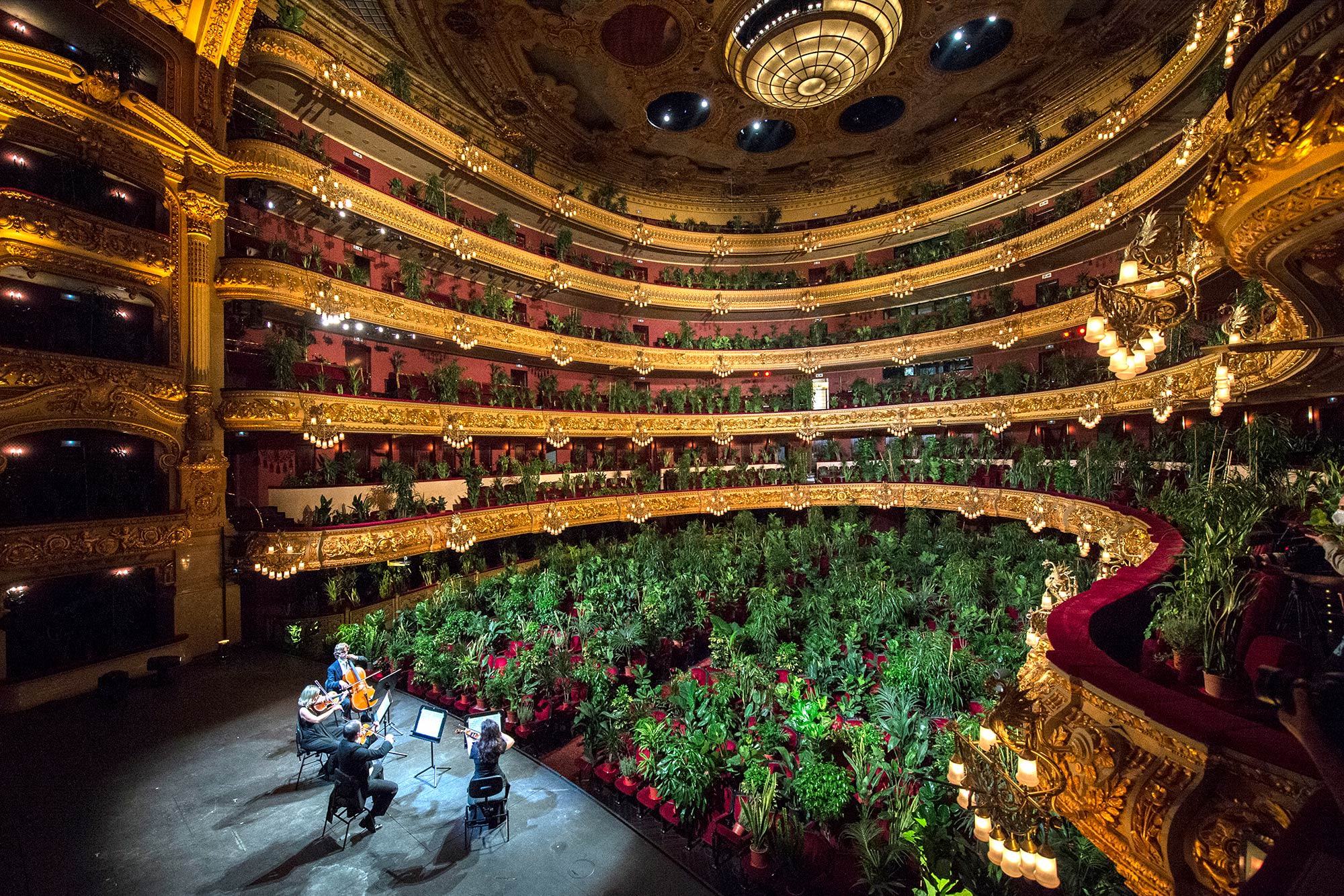 Musicians from the string quartet UceLi Quarte perform Puccini's "Crisantemi" for an audience of 2,292 plants in Barcelona, Spain, on June 22. The plants were later delivered to health care professionals. (Jordi Vidal / Getty Images)