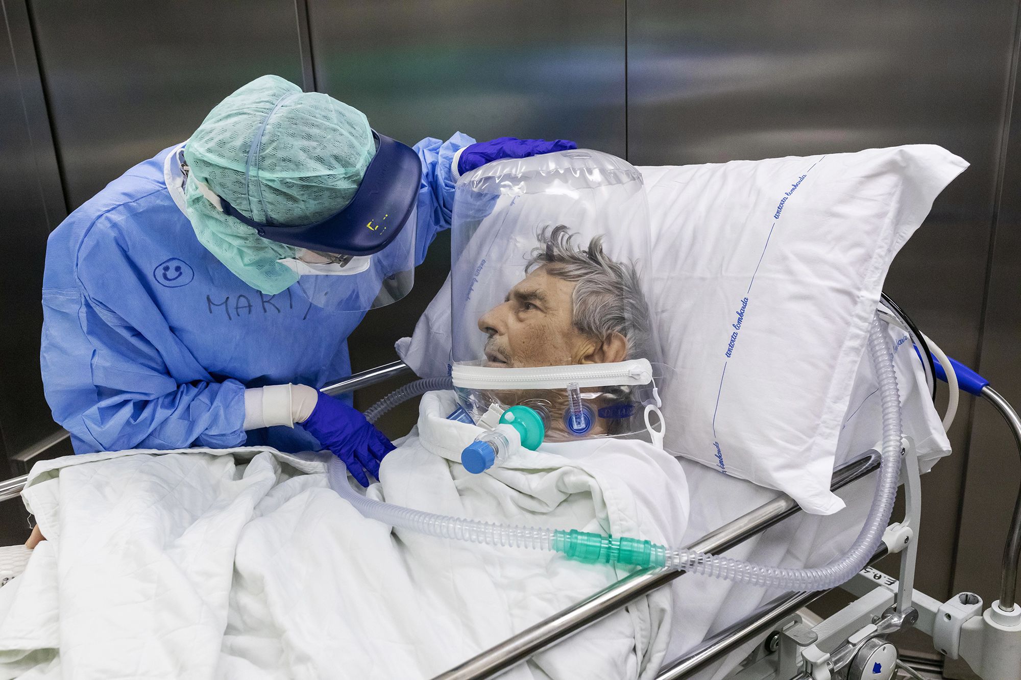 A Covid-19 patient is moved out of the intensive care unit of the Pope John XXIII Hospital in Bergamo, Italy. (Marco Di Lauro / Getty Images)