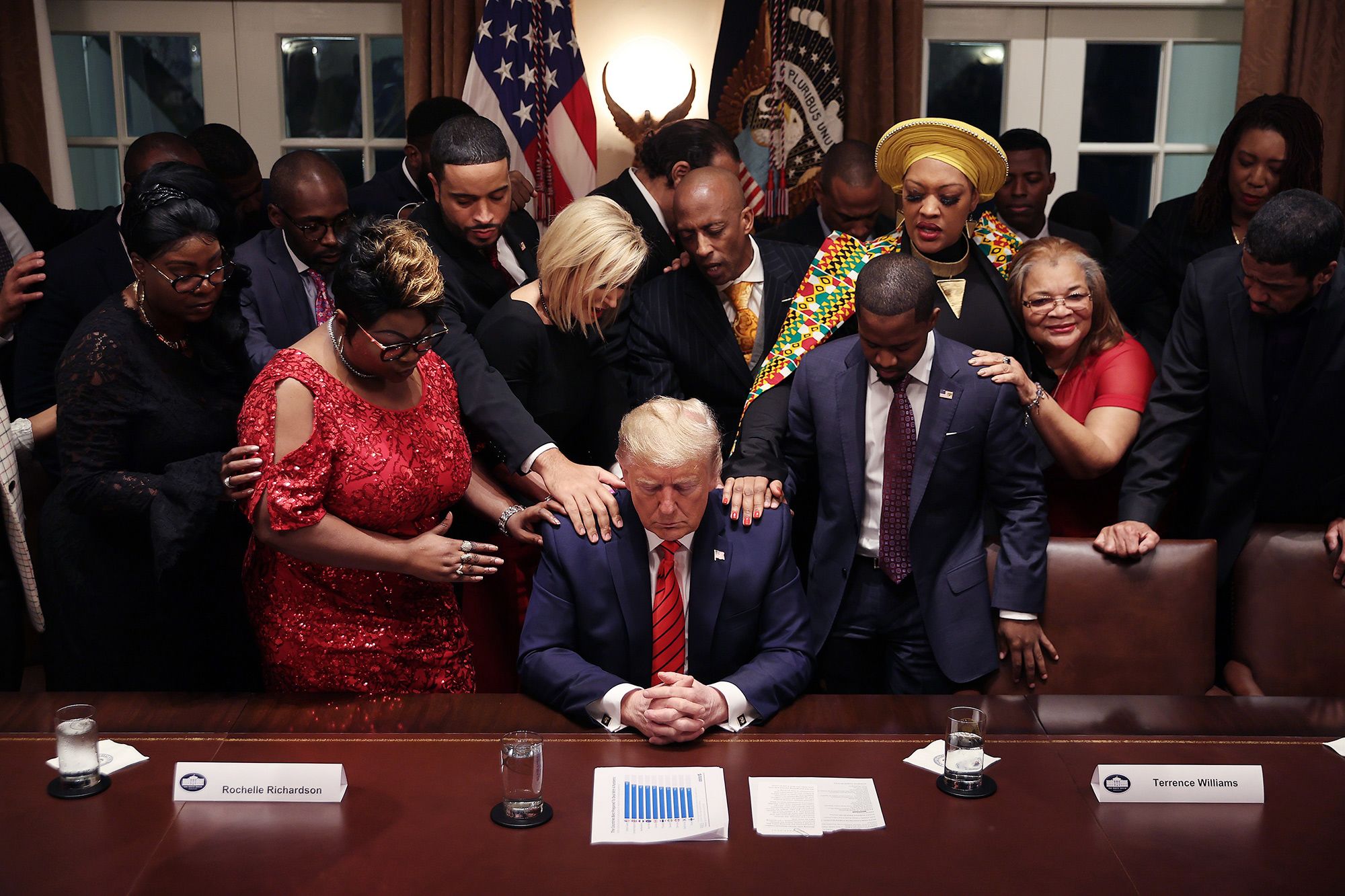 Supporters pray with President Donald Trump after a news conference and meeting at the White House on Feb. 27. (Chip Somodevilla / Getty Images)