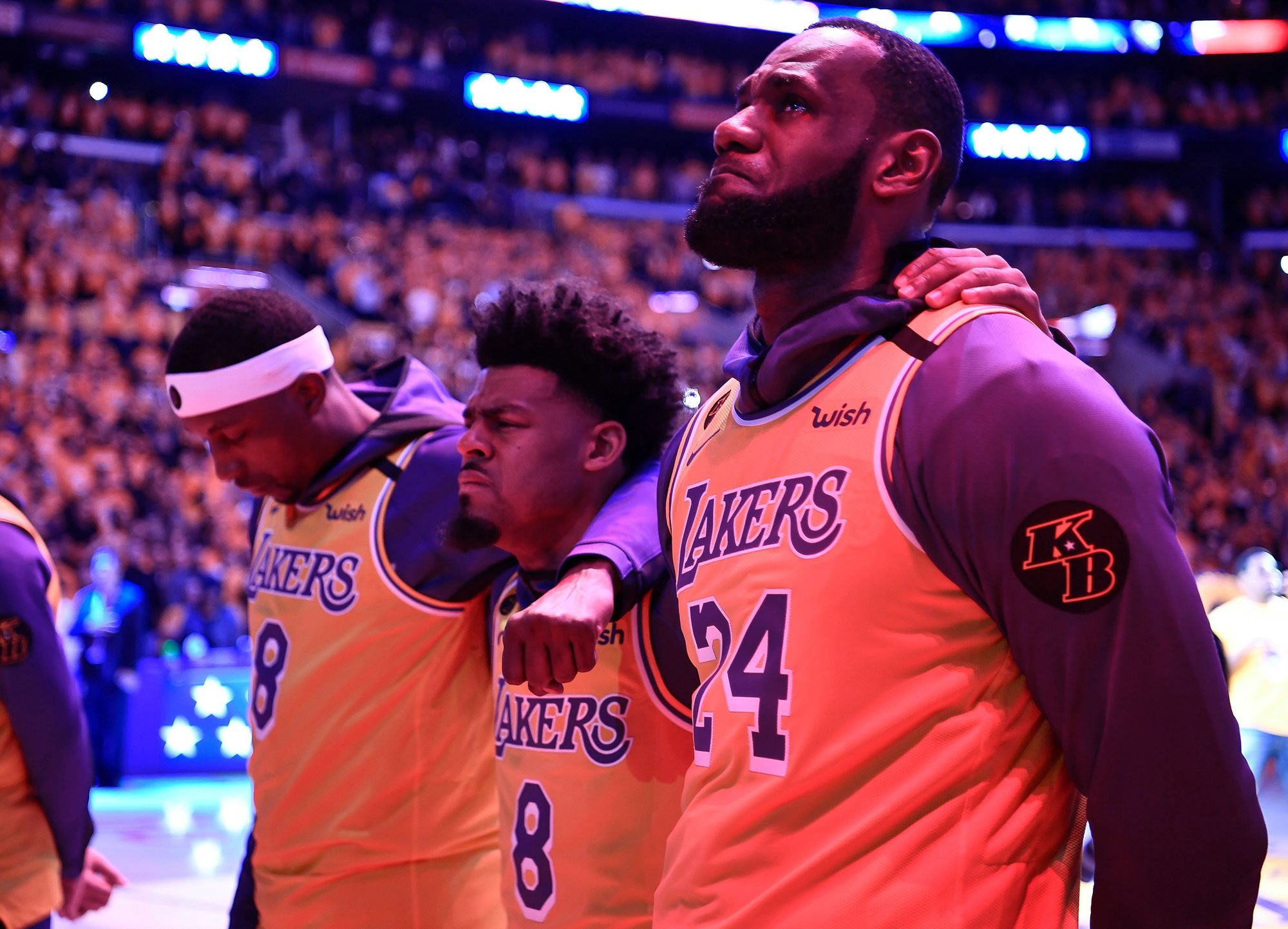 Lakers forward LeBron James cries during the national anthem after a pre-game tribute to Kobe Bryant at Staples Center in Los Angeles on Jan. 31. (Robert Hanashiro / USA TODAY Sports via Reuters)