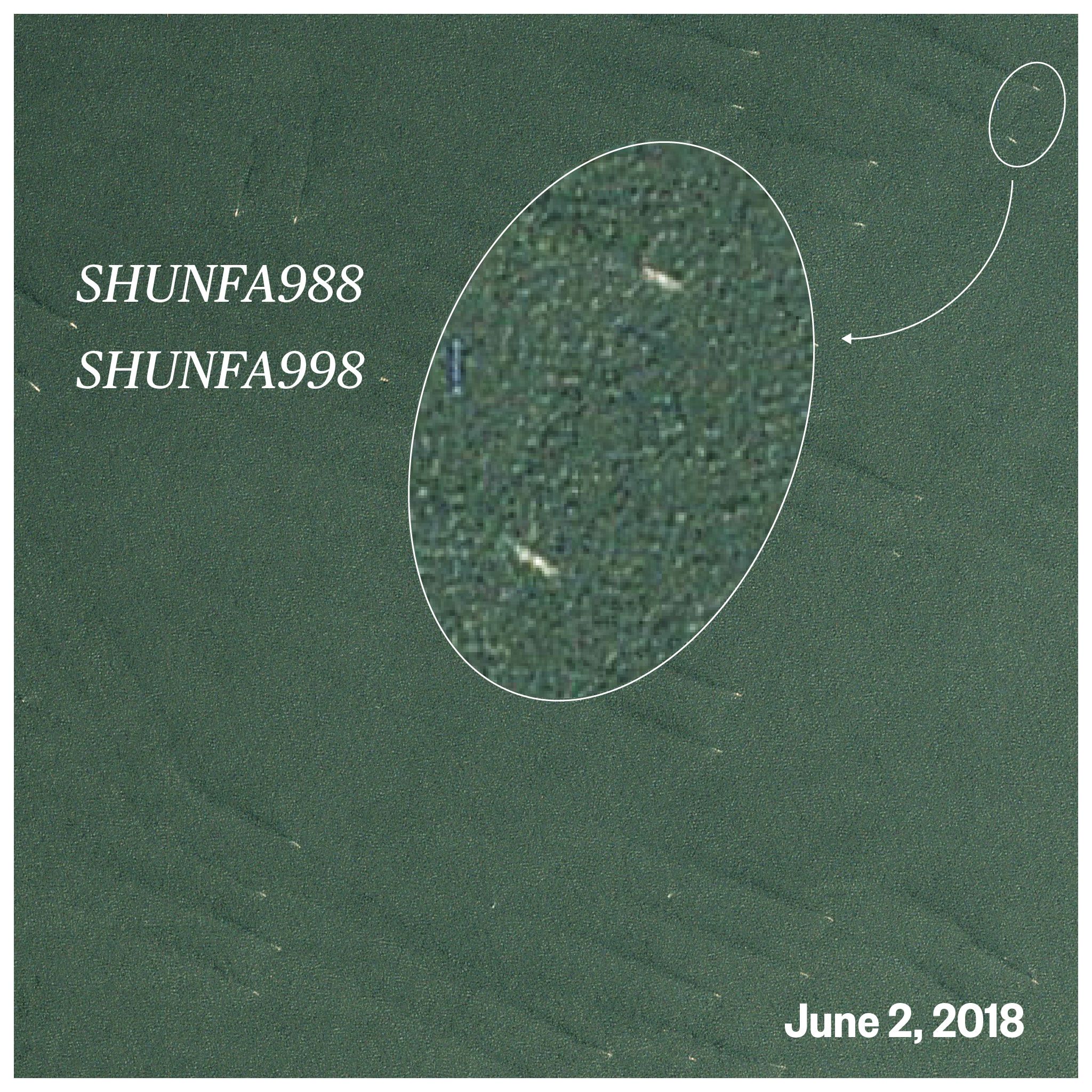 SHUNFA988 and SHUNFA998 are among many side-by-side "pair trawlers" confirmed by Global Fishing Watch. By analyzing each ship’s Automatic Identification System (AIS) signal and overlaying the daytime optical images, it was possible to detect that these two vessels were engaged in fishing activities in North Korean waters between May and June 2018.
