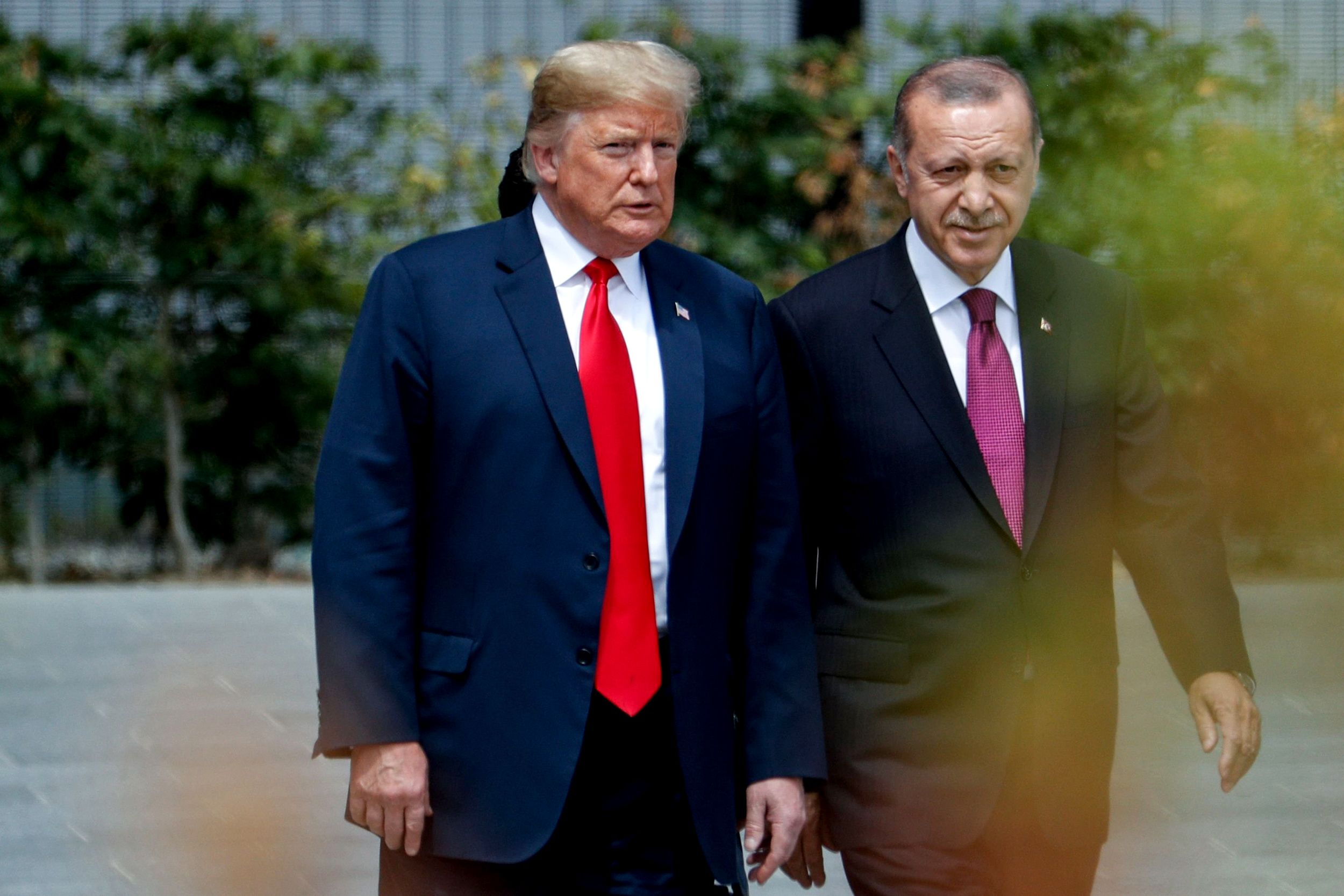 President Donald Trump, seen here with Turkish President Recep Tayyip Erdogan at a 2018 NATO summit in Brussels, has said that the two have a warm relationship. (Geoffroy van der Hasselt / AFP via Getty Images file)