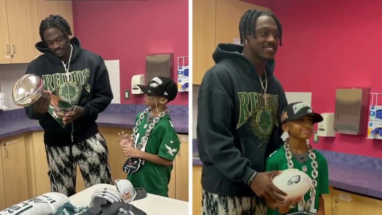 A 10-year-old Philadelphia boy who protected his sister when an air ambulance crashed in the city might not be able to go to the Super Bowl victory parade, but he did get a visit from Philadelphia Eagles star wide receiver A.J. Brown in the hospital.