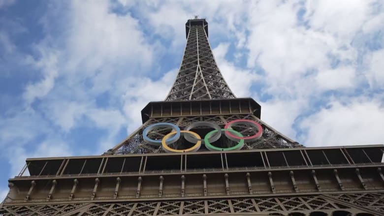 The Olympic rings on the Eiffel Tower in Paris. Pierre Crom / Getty Images