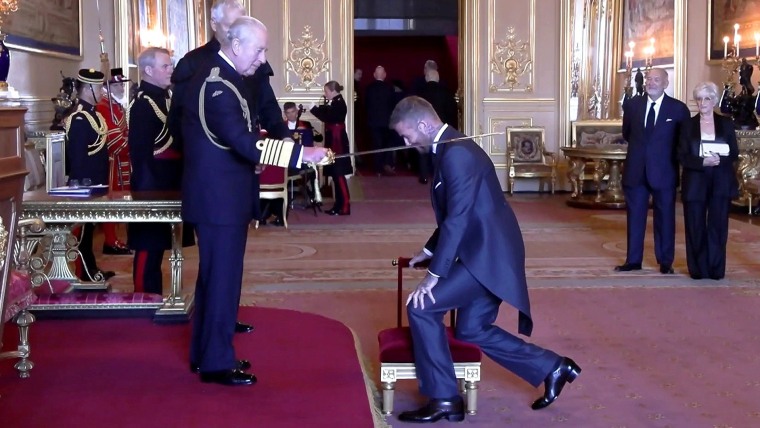 King Charles III tapped his shoulders with the blade of a sword and "Becks" was transformed to Sir David Beckham.