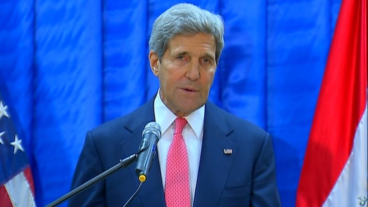 Iraq "had not asked for American forces on the ground," Kerry said, adding that Iran’s military involvement in the conflict was just "collateral." The U.S. "does not coordinate or cooperate with Iran militarily and has no intention of doing so in the future," he said. Kerry also reiterated his praise for Prime Minister Haidar al-Abadi after their first major meeting, calling the formation of his inclusive government "truly historic." The secretary of state is on a tour of the Mideast designed to drum up support for a coalition to combat ISIS, a group he described as the "manifestation of evil.” Kerry's visit falls on the eve of a U.S.-Arab nation meeting on defeating ISIS militants. He said that 40 counties had already been involved in the push and that "nearly every country on earth could have a part." Earlier on Wednesday he met al-Abadi in the presidential palace where Saddam Hussein once held court. As Kerry and al-Abadi met, two car bombs exploded in Baghdad.