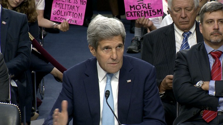 U.S. Secretary of State John Kerry appears at a Senate hearing to explain the need to combat ISIS militants in the Mideast and speaks directly to a group of protesters in attendance.