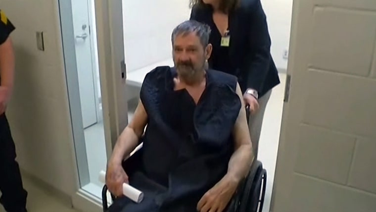 Looking slightly disheveled, he wore a sleeveless Kevlar smock and was taken via wheelchair to appear on a video feed before a judge.