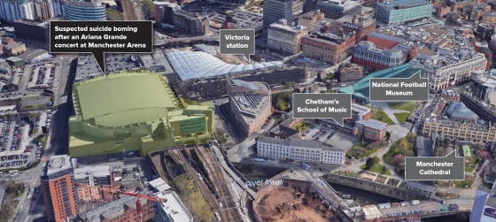 The suicide bomb attack that killed at least 19 people and injured scores more after an Ariana Grande concert Monday night was centered outside the massive Manchester Arena in the heart of that city in northern England.