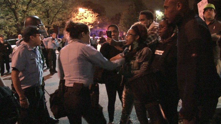 Against that backdrop, an off-duty officer in neighboring St. Louis shot and killed Vonderrit Myers, a high-school student who was facing trial on a weapons charge, on Wednesday night. Police say the officer fired 17 times after Myers shot at him, but city and state leaders have called for a Justice Department probe into possible racial profiling. A quiet candlelight vigil for Myers turned rowdy as protesters taunted police officers in riot gear. Some in the crowd attacked police vans, and officers used pepper spray to keep people back. Of those arrested, five were charged with unlawful assembly, two with property damage and one with marijuana possession.
