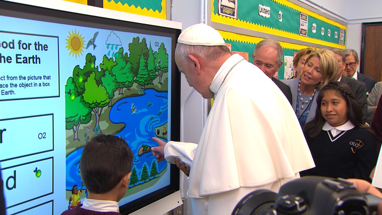 It was Essa Nahshal’s job during the classroom tour to show the pope the smartboard, an interactive display used as an educational tool.