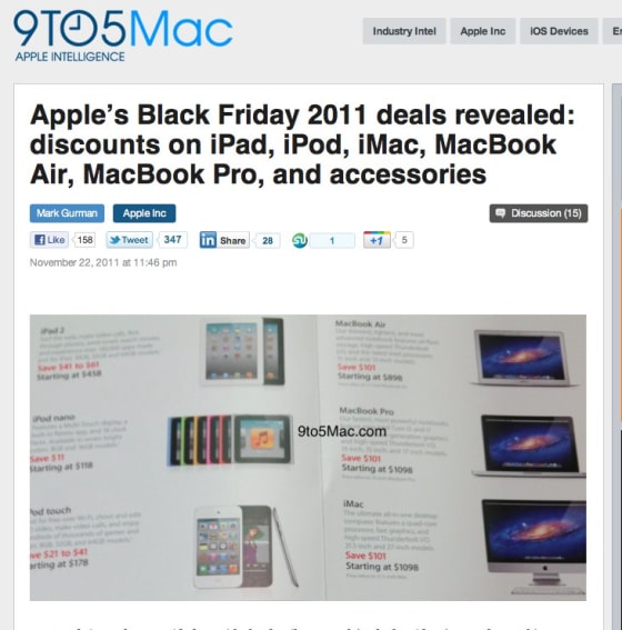 The folks at 9to5 Mac have gotten their hands on what they believe is a list of Apple's Black Friday 2011 deals. We wouldn't be surprised if they turned out to be correct in that assumption as the leaked price breaks are on par with what we've seen in prior years.