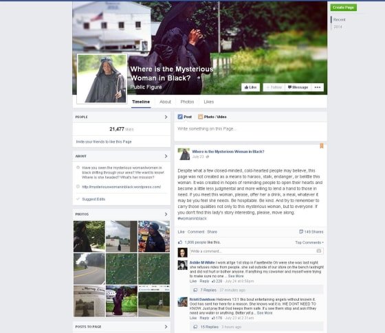 A woman wearing a flowing, black dress and mysteriously strolling along busy highways in parts of the U.S. Southeast and Midwest has the curious wondering who she is. She has been dubbed the "Woman in Black" by TV stations, police and followers on the Web. People have been posting pictures documenting sightings of her on a Facebook page titled “Where is the Mysterious Woman in Black?” and on Twitter with the hashtag #womaninblack. "We offered her food, water and a spot to rest and a little money to help her on her way...but she very politely declined," one Facebook user wrote.