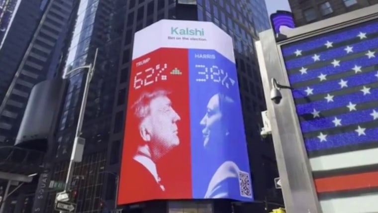 A federal appeals court recently overturned the CFTC’s decision to prohibit election betting company Kalshi from limiting “U.S. persons” from placing bets on their markets — but Polymarket wasn’t part of that suit, and the law that prohibits betting on Polymarket is still in place. Kalshi’s stats show a 59% and 41% division between Trump and Harris, respectively. The company has also used social media to promote election betting, spending over $140,000 on Meta ads, according to the company's ad library.