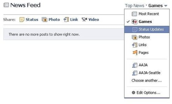 But Facebook's latest additions will probably not stir up that kind of drama, because it actually makes sifting through the News Feed so much easier: filters in the form of a drop-down menu below the "Most Recent" tab that allows users to view only Status Updates, Photos, Links, Pages and Games, depending on what they choose. They can also choose lists of friends, if they don't feel like going through every Facebook friend. Unfortunately, the choice doesn't stick once you move from the page, which is kind of annoying, but at least when I just want to skim through Status Updates, I can do that easily, or when I want to see what new photos people are uploading, I can do that too.
