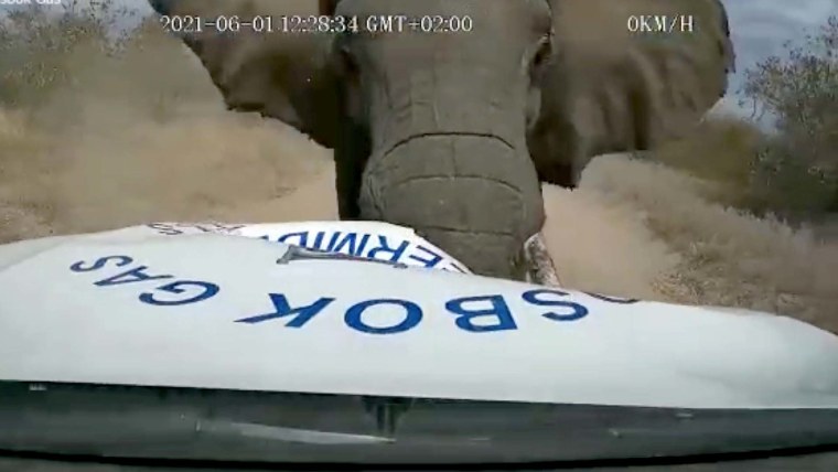 Dashcam video from Hoedspruit, South Africa, shows a protective elephant smashing the truck backwards, away from its herd. A second camera caught the driver’s shocked reaction.June 9, 2021