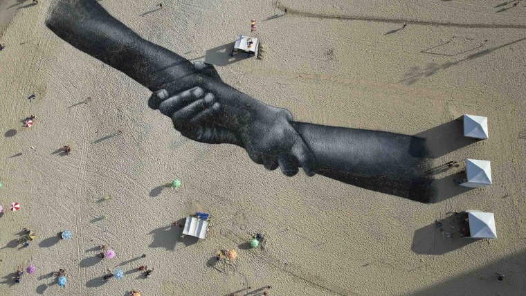 Artist creates giant symbol of togetherness on Rio's Copacabana beach