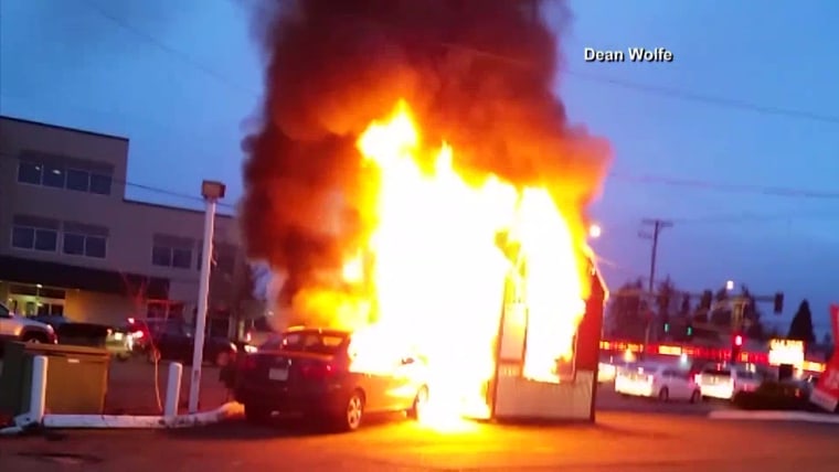 Fire officials in Everett, Washington, said a woman employee was taken to hospital suffering from burns after a coffee stand fire late Thursday afternoon.Jan. 8, 2016
