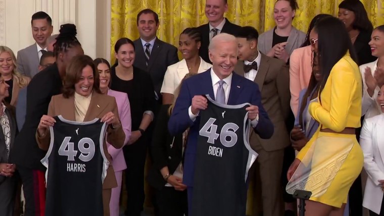 President Biden and Vice President Harris hosted the Las Vegas Aces at the White House to celebrate their WNBA championship win. Both the president and vice president praised their achievements and were given customary jerseys from the winning team. May 9, 2024