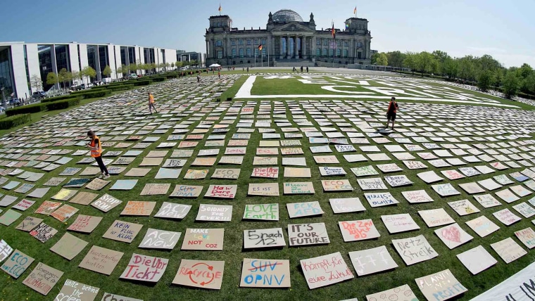 Young activists from the "Fridays for Future" climate change group arranged thousands of placards outside the German Parliament.April 24, 2020