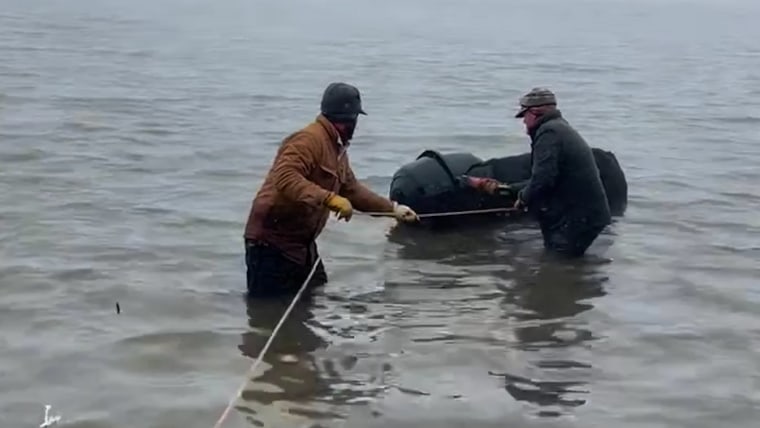 Two ranchers stepped into freezing water to rescue a cow. They put a container over the animal’s head and led it to shore with a rope. After some mooing in the water, the cow appeared to make it safely to solid ground.Jan. 25, 2026