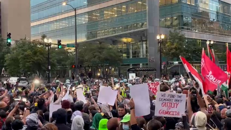 A crowd of pro-Palestinian protesters clashed with Chicago police outside of the Israeli Consulate amid the Democratic National Convention.Aug. 21, 2024