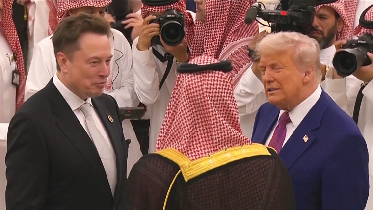 President Trump and Saudi Crown Prince Mohammed Bin Salman greeted Tesla CEO and billionaire Elon Musk in Riyadh, Saudi Arabia, during a welcome ceremony for the president. The two leaders spoke with Musk during a reception held for Trump at the start of his four-day visit to the Gulf region.May 13, 2025