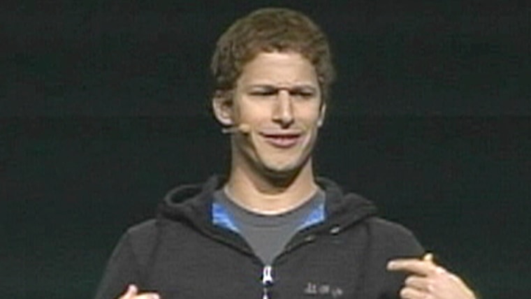 02:07 Comedian Andy Samberg kicks off Facebook's F8 conference, pretending to be Mark Zuckerberg and introducing fake new features for the service, until the real Zuckerberg takes the stage. Sept. 22, 2011
