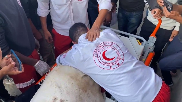 NBC News was filming at Al Aqsa Hospital in Deir al-Balah when paramedic Abdulaziz al-Bardain realized one of the casualties he had been transporting as an “unknown” was in fact the body of his own mother.Oct. 30, 2024