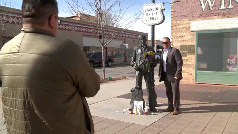 Fans paid tribute to the songwriting skills of Glenn Frey at the statue and mural celebrating a line from the 1972 hit "Take It Easy" in Winslow, Arizona.Jan. 20, 2016