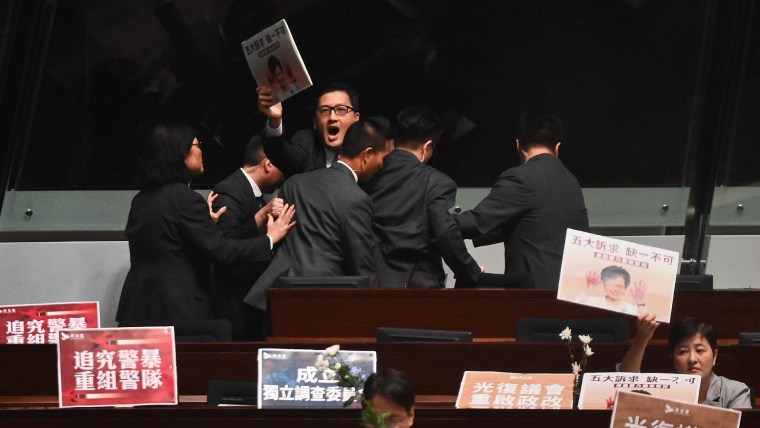Hong Kong Chief Executive Carrie Lam was hounded out of the council chamber by lawmakers as she tried to answer policy questions.Oct. 17, 2019