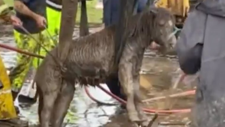 A team of rescuers dragged a horse and pony from a thick, glutinous mudslide in Salinas, California.Jan. 29, 2021