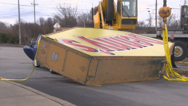 Elizabethtown police say the large restaurant sign fell from a pole during high winds, crushing a car carrying three people. WAVE's David Ochoa reports.Jan. 20, 2023