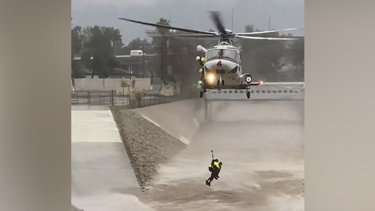 Los Angeles firefighters used a helicopter to rescue a man who jumped into the flooded river to save his dog.Feb. 6, 2024