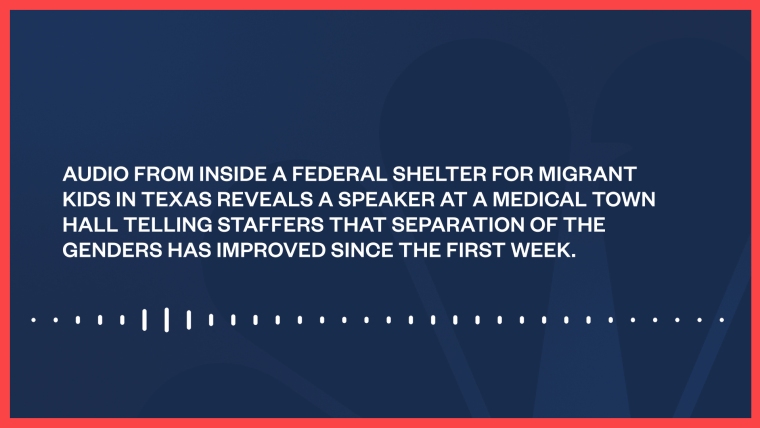 Audio from inside a federal shelter for migrant kids in Texas reveals a speaker at a medical town hall telling staffers that separation of the genders has improved since the first week.July 31, 2021