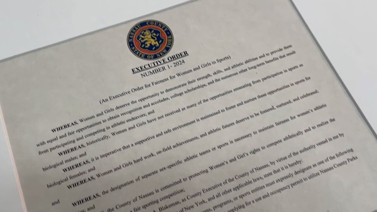 Nassau County Executive Bruce Blakeman announced a new ban prohibiting transgender athletes from competing against girls at all 100 sports facilities run by Nassau County, including ball fields and ice rinks. WNBC's Greg Cergol reports.Feb. 23, 2024