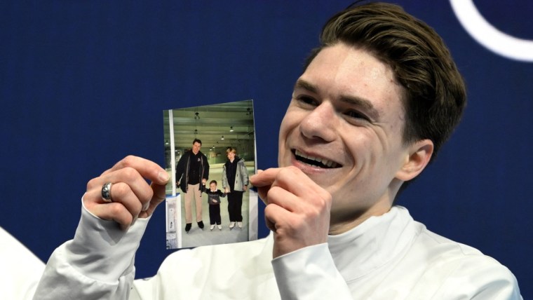Figure skater Max Naumov began his performance with a jumbotron tribute to his parents, both of whom were killed in a plane crash last year. NBC News’ Tom Llamas caught up with him in Milan.Feb. 10, 2026