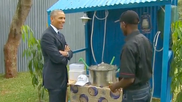 President Obama, taking a tour of sustainable technologies in Kenya, jokes with a man, who shows him a biofuel digester, which the President asks him if instead of making biofuel, he's making moonshine.July 25, 2015
